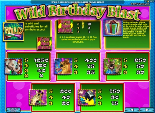 Вас никогда не выселяли из съемной квартиры после того, как вы весело отметили в ней день рождения? Признаться, автору этой статьи приходилось в подобных ситуациях и самому искать новое жилье, и помогать друзьям собирать вещи. Вот и звери, которые стали главными героями видео-слота Wild Birthday Blast, решили устроить шумную вечеринку. Как она у них пройдет, вы узнаете, лично протестировав бесплатный игровой автомат Wild Birthday Blast. Ее разработала компания 2by2 Gaming, но в интернет-казино модель представлена на платформе Quickfire от Microgaming.