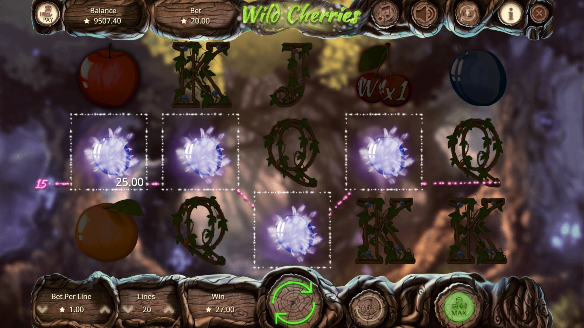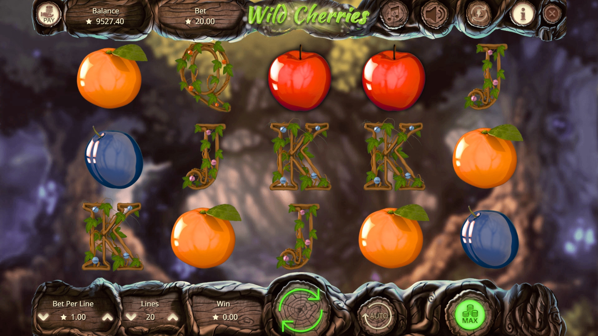 Открыв игровой автомат Wild Cherries, вы увидите эффектные ягоды и фрукты, а также яркие карточные номиналы, увитые лозой.