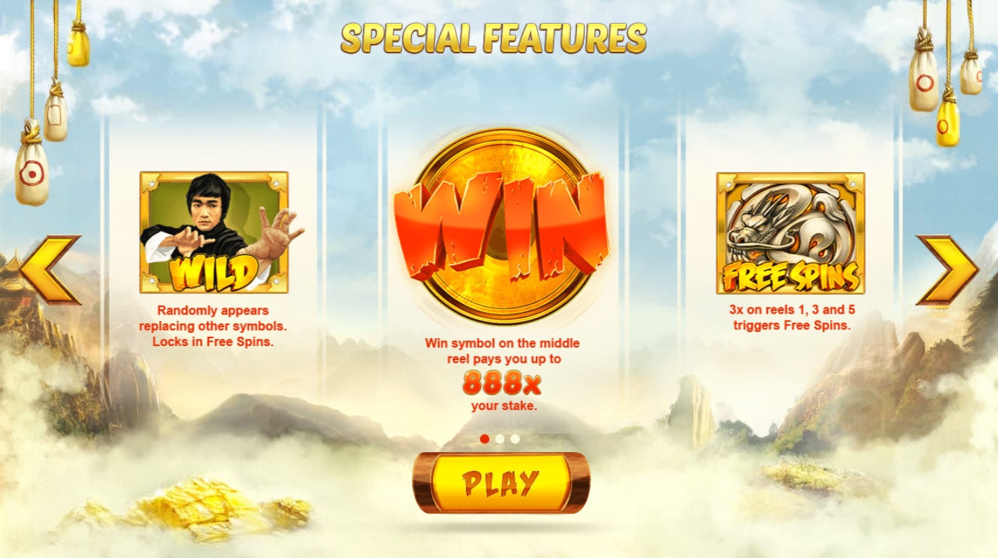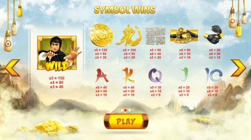 - Wild (Брюс Ли) может составлять комбинации сам по себе. Также он способен заменять базовые картинки в цепочках. В случайно выбранных спинах Wild неожиданно возникает на разных позициях, способствуя получению многочисленных выплат.