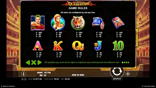 Видео-слот Wild Gladiators имеет пять основных барабанов с картинками нескольких типов и шестую колонку с множителями и бонусными иконками. Активных линий двадцать пять. Их количество неизменно.
