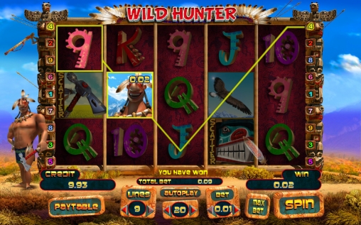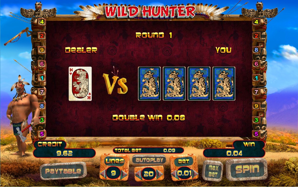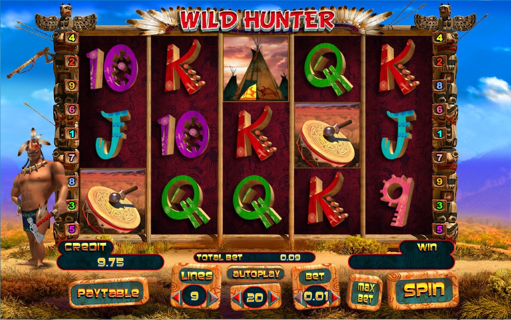 Wild Hunter – классный 3D-слот с пятью барабанами, девятью линиями, тремя рядами картинок на экране и разнообразными функциями, в числе которых особые символы, призовые спины, риск-игра по шансам и другие опции. Все они рассматриваются ниже.