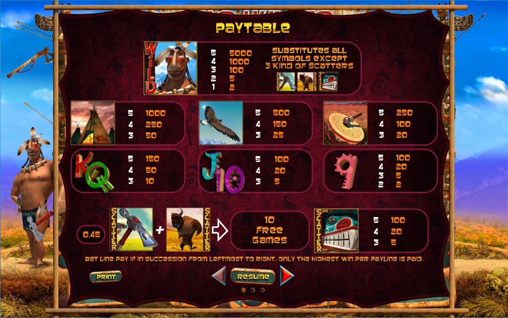 Главным действующим лицом игрового автомата является мускулистый охотник-индеец. Он постоянно находится слева от основного экрана, веселя пользователей забавной мимикой и веселыми ужимками. На барабанах изображены картинки с вигвамом, орлом, тамтамом и номиналами игральных карт от девятки до туза, выдержанными с характерном для данной темы стиле.