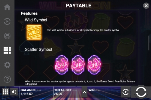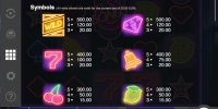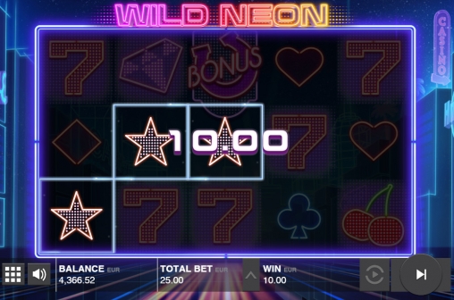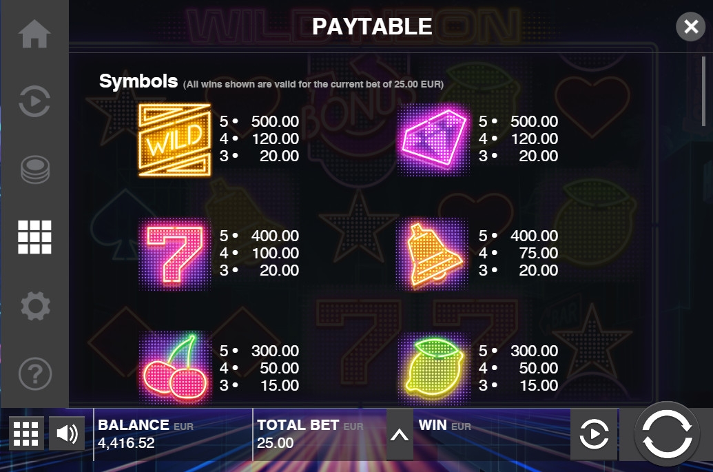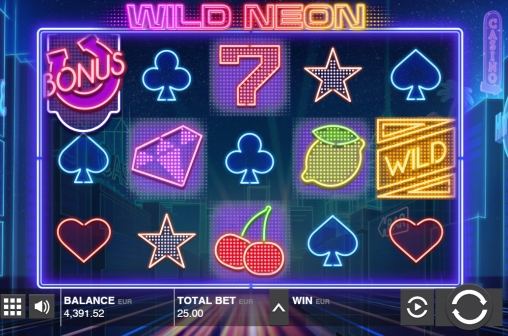 Wild Neon имеет пять барабанов с тремя картинками в видимой части каждого из них. Здесь двадцать пять фиксированных полос, на которые принимаются равные ставки: от 0.01 до четырех долларов на линию. На спин разрешается ставить не менее 0.25 и не более ста долларов.