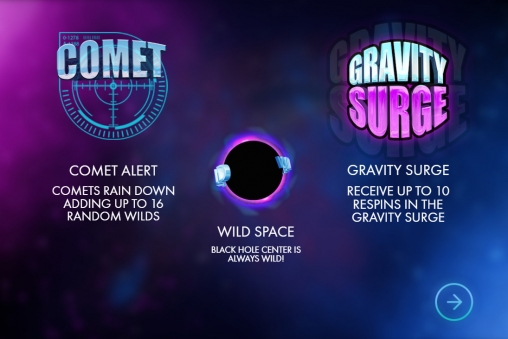 - Gravity Surge – Данная опция также запускается случайным образом в любом стандартном розыгрыше. Игрок получает право на участие в трех-десяти респинах. Ставку за него будет делать казино. С каждым новым вращением в серии картинки на экране затягиваются в черную дыру, а на освободившихся позициях возникают новые символы.