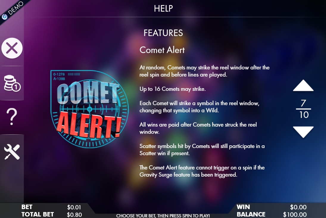 - Come Alert Bonus – В любом обычном спине игровое поле может подвергнуться атаке комет, сталкивающихся с картинками на экране. Их может быть до шестнадцати. Каждый элемент после удара превращается в джокер. Скаттеры остаются сами собой. Далее происходит начисление выплат по комбинациям, образовавшимся с участием новых символов Wild.