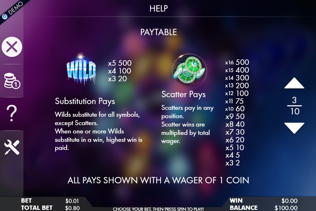 - Wild (обледеневшая надпись) сам может составлять оплачиваемые цепочки и способен заменять другие элементы, кроме скаттеров.