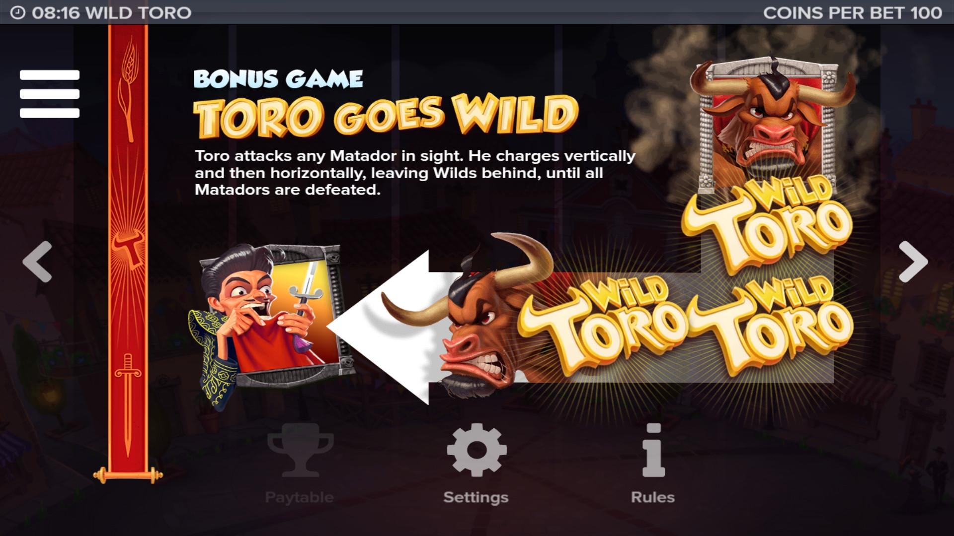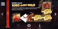 - Toro Goes Wild – Появляясь в любой позиции на пятом барабане, бык начинает атаковать матадора. Он направляется к герой, двигаясь сначала вертикально, а затем горизонтально. За собой бык оставляет след из символов Wild. Когда он побеждает всех матадоров, происходит начисление выплат по комбинациям. Далее бык продолжает движение влево, пока не исчезнет за пределами экрана, также превращая картинки в Wild на своем пути.