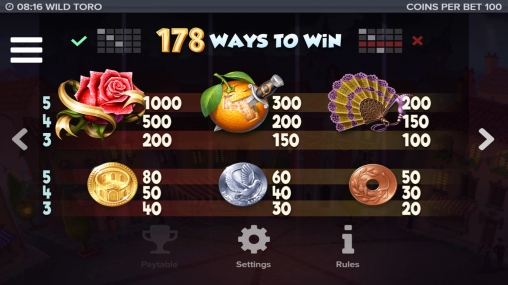 Wild Toro представляет собой пятибарабанный видео-слот с двадцатью картинками на экране и 178 способами формирования выигрышных цепочек без активных линий.