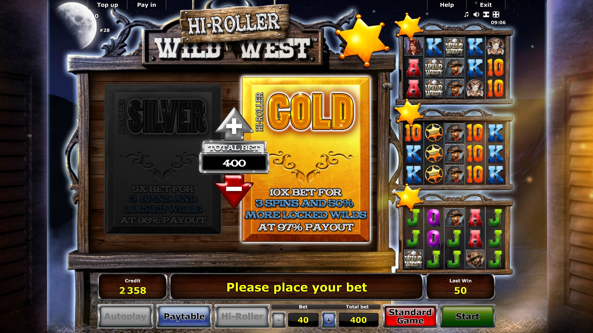 - Hi-Roller Gold – Десятикратная ставка начинает три спина с теми же функциями символа Wild, который здесь выпадает на 50% чаще.
