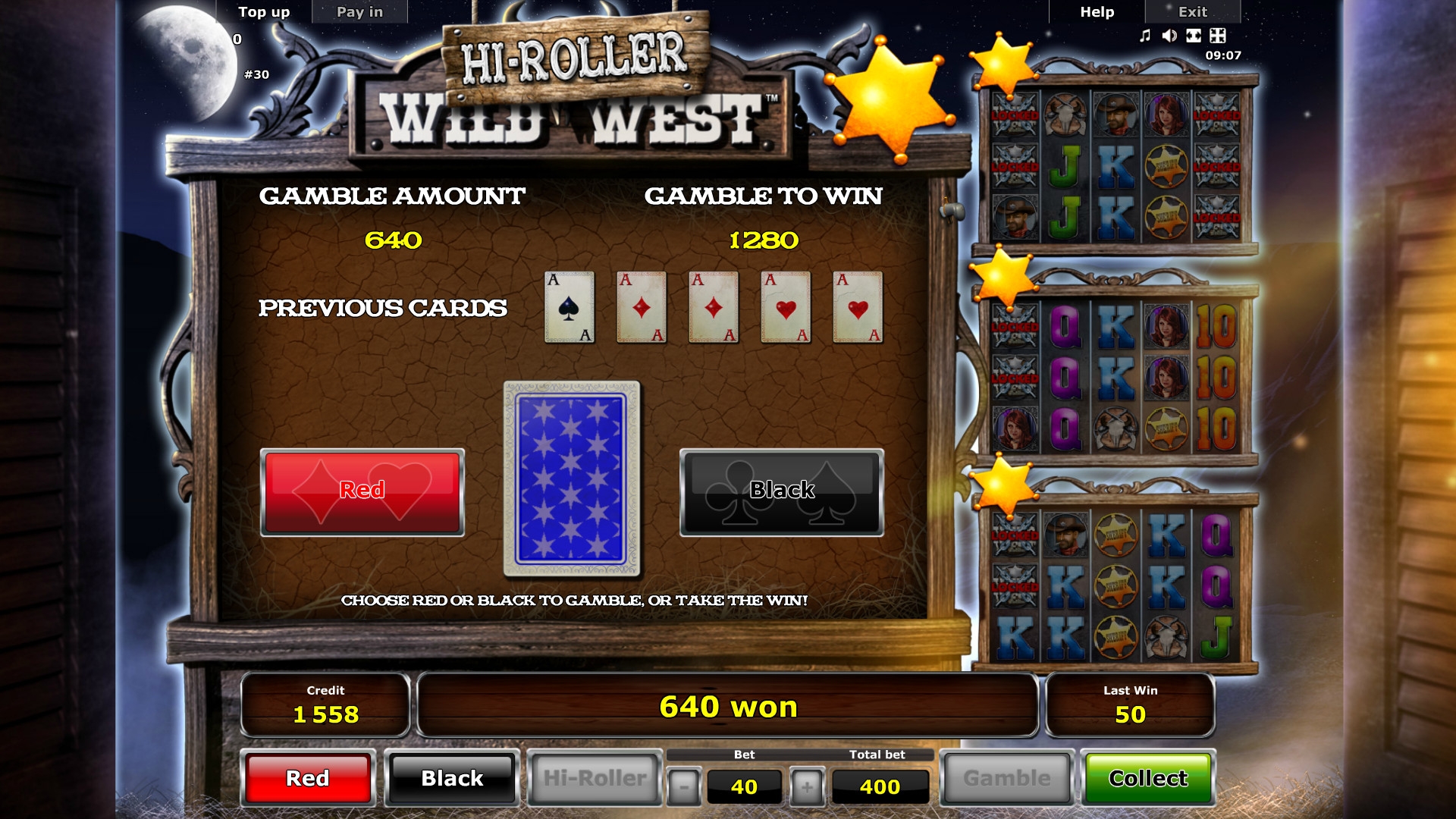 В Wild West Hi-Roller есть игра по шансам, в которой для удвоения выплаты нужно угадать цвет закрытой карты. Вероятность победы здесь 50:50.