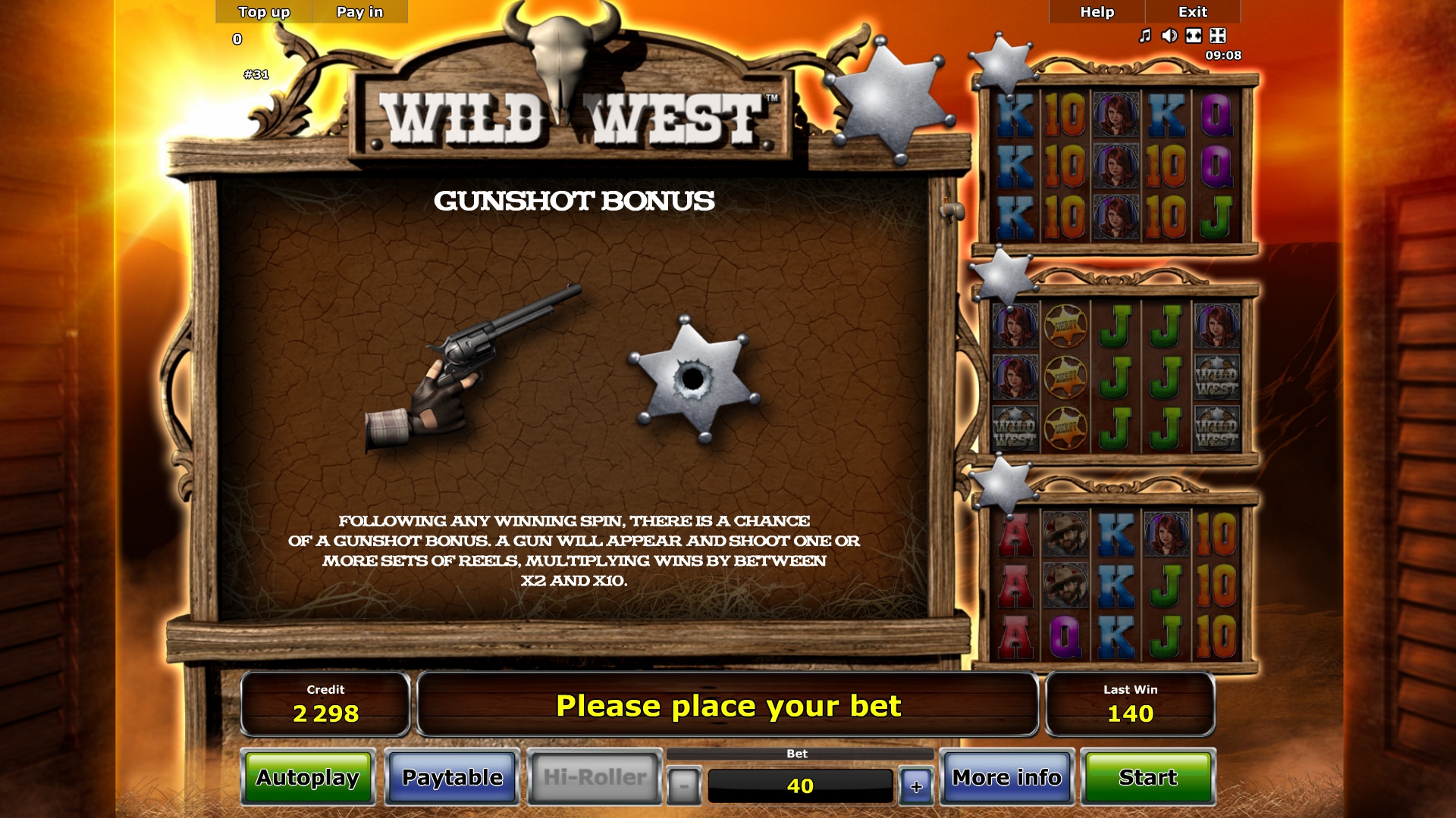 - Gunshot Bonus – Раунд может начаться после любого спина, который принес выигрыш. На экране появится револьвер. Из него будут произведены выстрелы, увеличивающие начисленную выплату в два-десять раз.