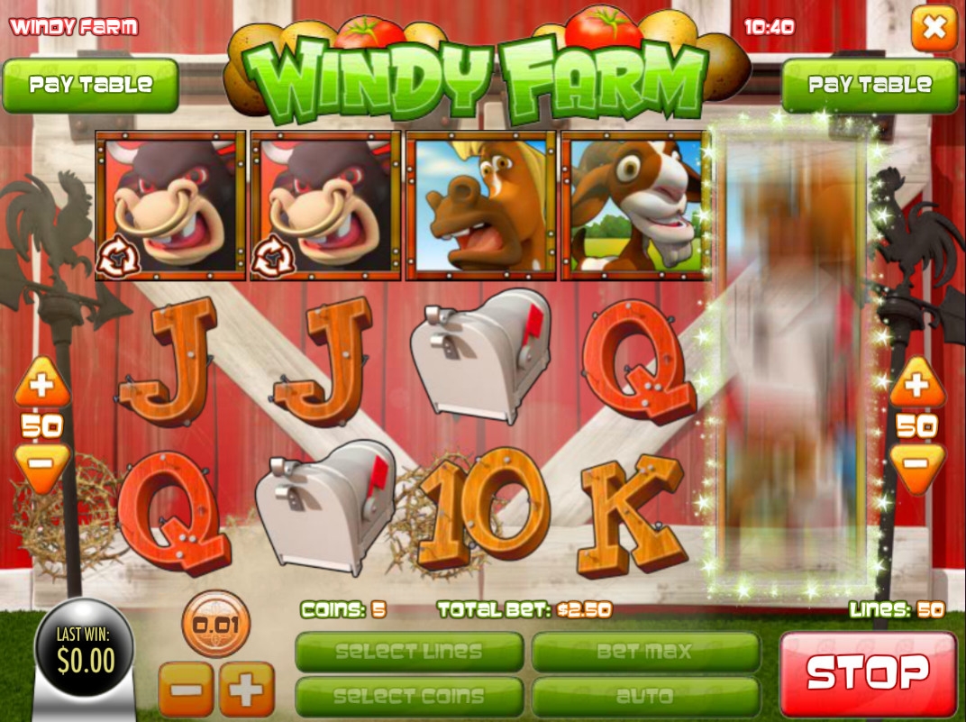 На экране игрового автомата «Ветреная ферма» появляются различные домашние животные, подкова, тележка, лейка, почтовый ящик и вырезанные из дерева номиналы карт от десятки до туза.