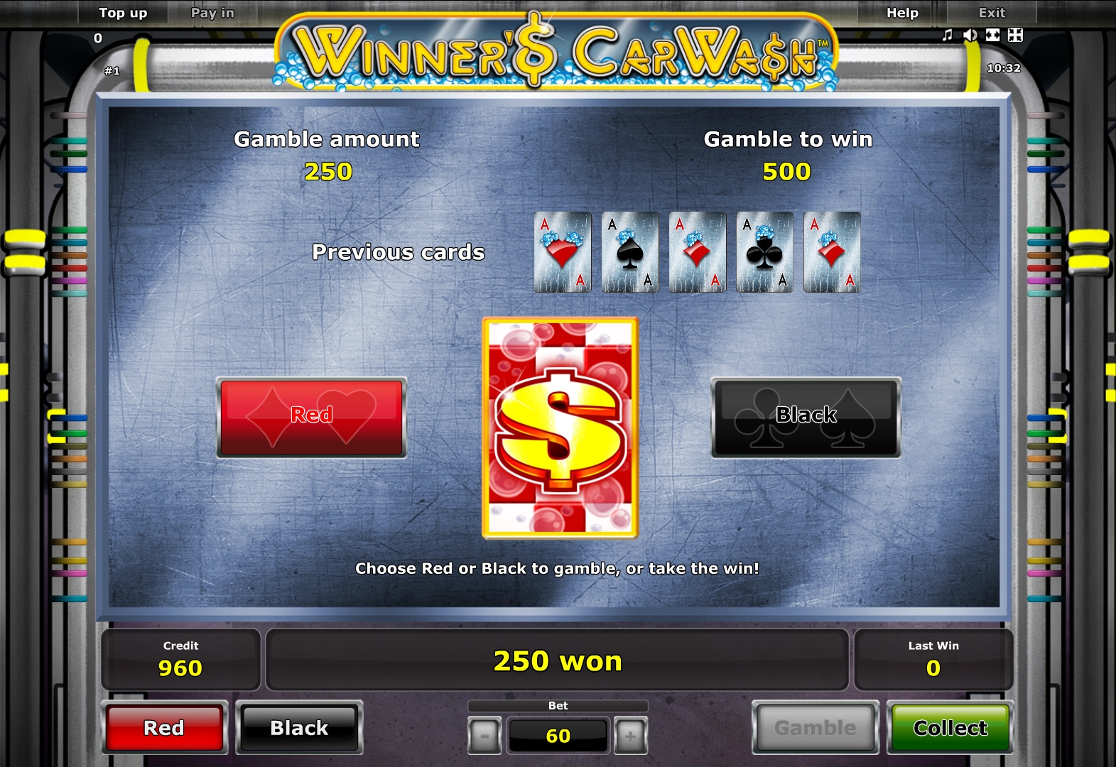 По завершению раунда, в котором были начислены деньги, нужно решить, забрать выигрыш или начать игру на удвоение. Если вы решите продолжить испытывать судьбу, на отдельном экране появится закрытая карта. Вы должны наугад сказать, будет она черной или красной. Угадаете – сумма увеличится вдвое, не угадаете – ставка уйдет в кассу заведения. О лимитах в данном раунде читайте в правилах.