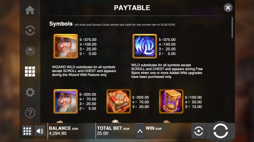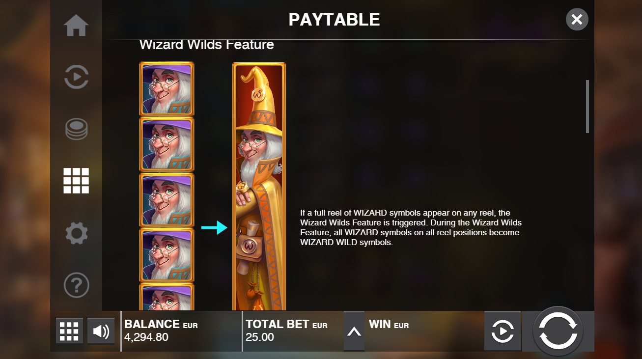 - Wizard Wild Feature – Если стек джокеров целиком занимает любую колонку, все волшебники превращаются в Wild и помогают составлять выигрышные цепочки.