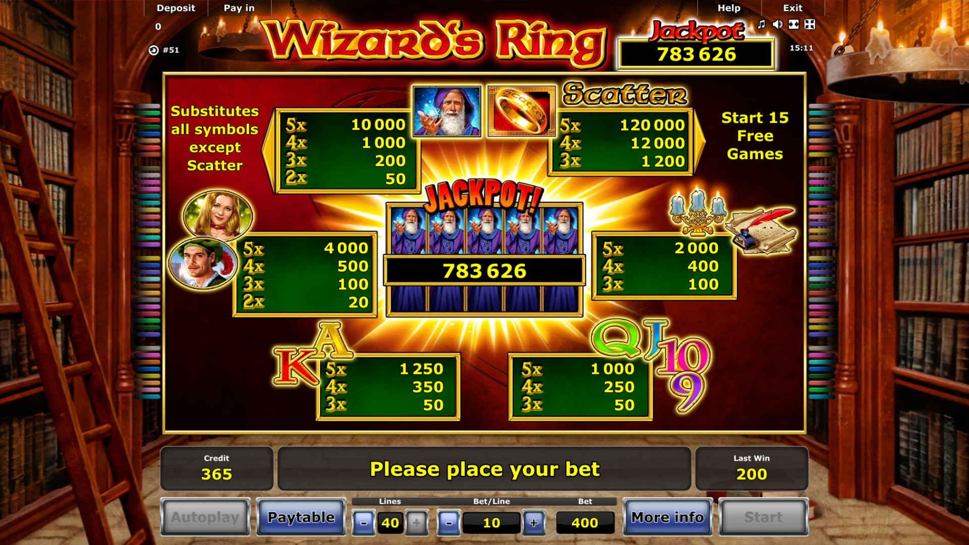 Для расчета выигрыша в каждом случае ставка по одной полосе умножается на коэффициент, заложенный в Wizard’s Ring для получившейся комбинации. Этот показатель бывает от х2 до х1000 (для скаттеров действуют отдельные множители). В одном спине допускаются многочисленные выплаты, но только с разных полос.