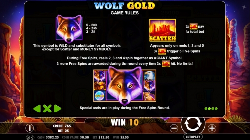 Регулировать в автомате можно параметры звука, скорости спина, автоигры и размеров экрана. Открывается Wolf Gold в браузере.
