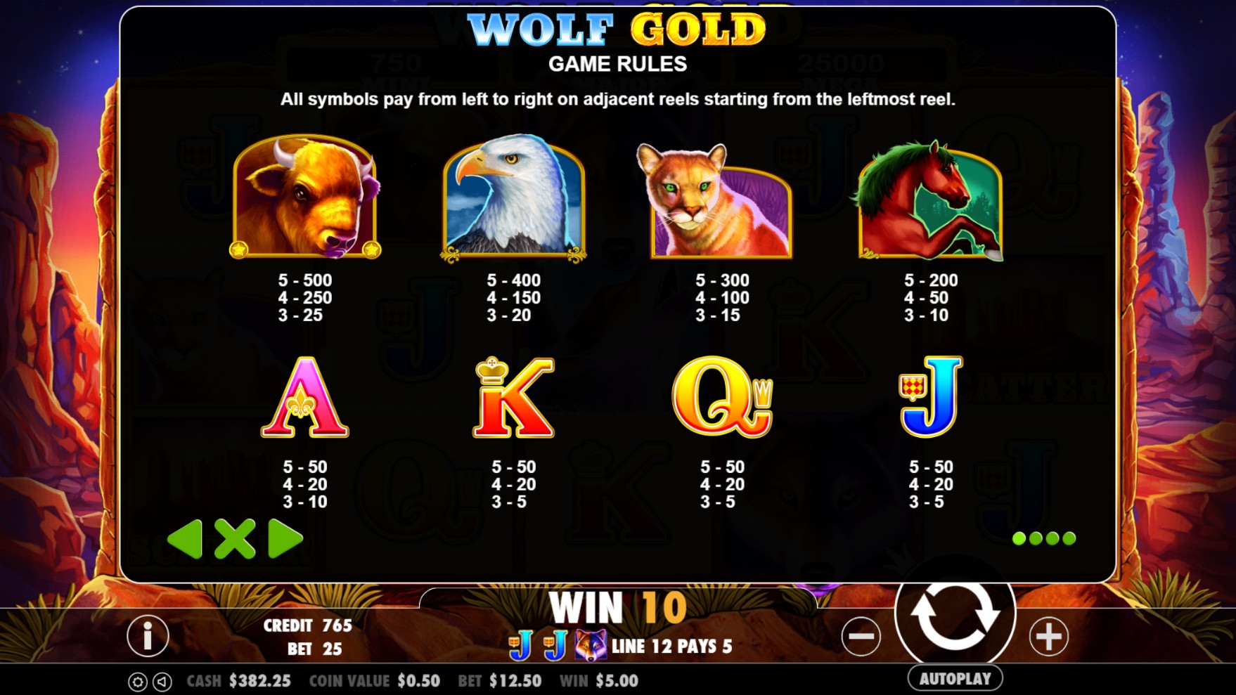 Выплаты рассчитываются перемножением ставки по линии на коэффициент сложившейся комбинации. В Wolf Gold он бывает от х5 до х500. Игра по равным шансам отсутствует, поэтому все деньги автоматически выводятся на баланс клиента.