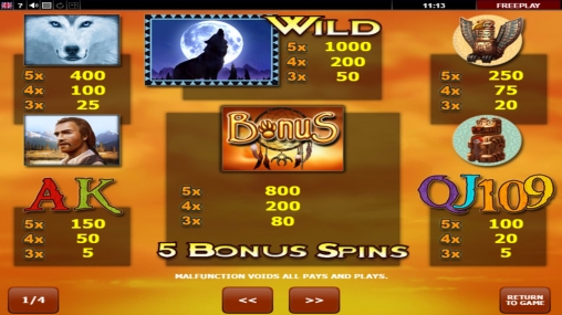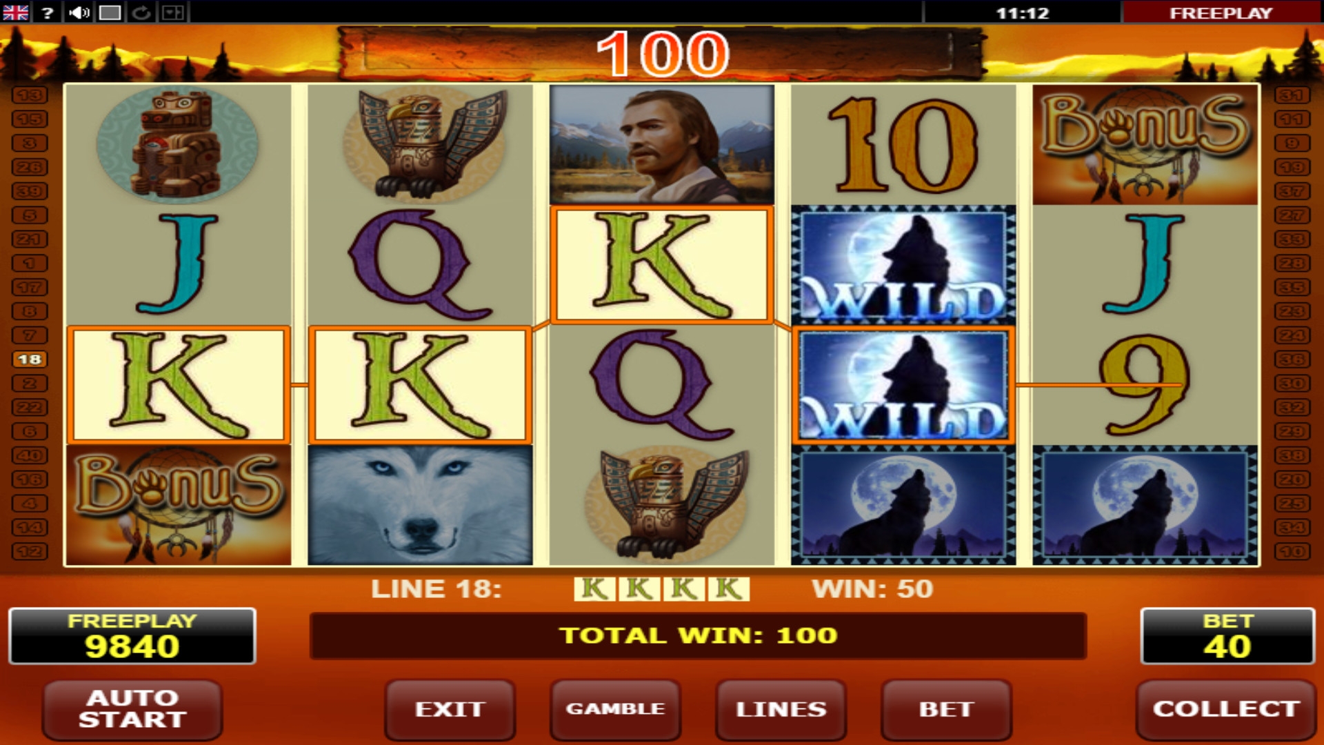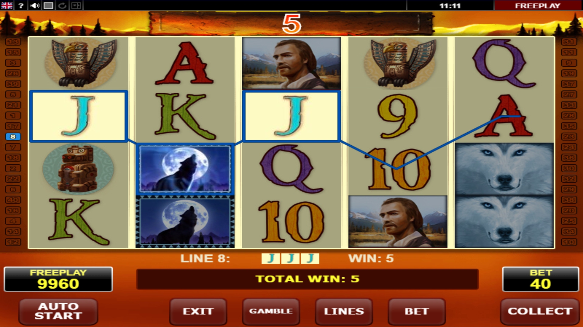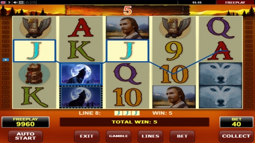 Белый волк, путешественник, индейские тотемы, а также номиналы карт от девятки до туза – эти картинки являются обычными и действуют по классическим правилам. В виде полос на барабанах изображен лишь странник.