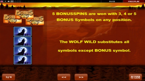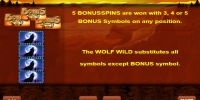 - Wild (силуэт волка на фоне луны) сам формирует высокооплачиваемые комбинации, а также помогает составлять цепочки из других картинок, кроме бонусной. В колонках он появляется очень длинными вертикальными стеками, благодаря чему нередко занимает столбцы снизу доверху.