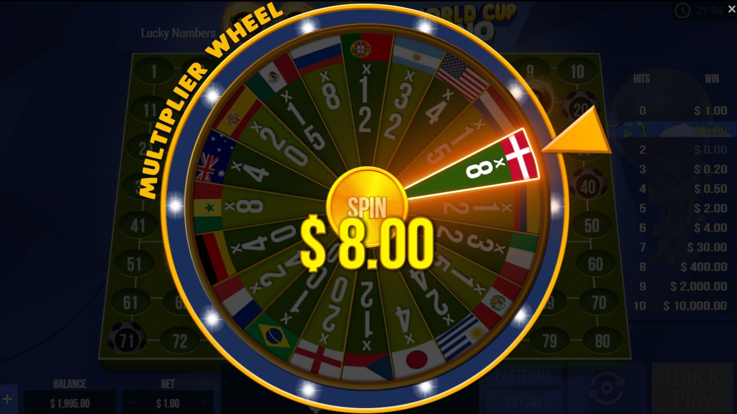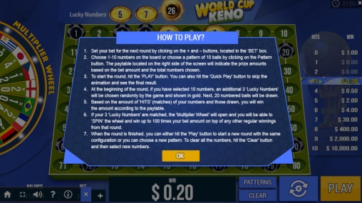 World Cup Keno – это онлайн-кено с восьмьюдесятью шарами, пронумерованными по порядку.