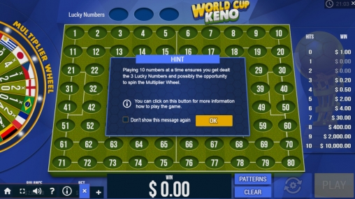 Если уж вы рискнете сыграть в «Кено Чемпионата мира», советуем выбирать десять номеров. В таком случае на поле будут три Lucky Numbers, которые дают шанс на участие в бонусном раунде.