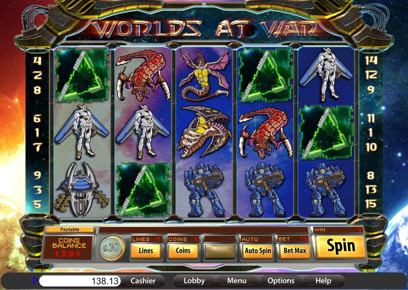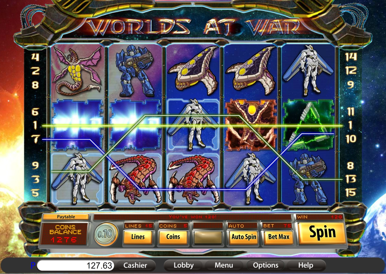 Worlds at War – бесплатный игровой автомат с пятью барабанами и пятнадцатью линиями, схема расположения которых изображена в таблице коэффициентов.
