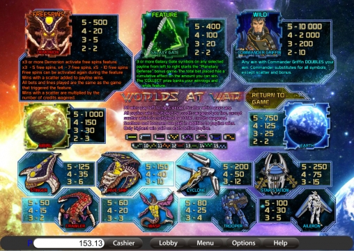 На экране видео-слота Worlds at War изображены две враждующие планеты, их солдаты и различные виды военной техники и оружия.