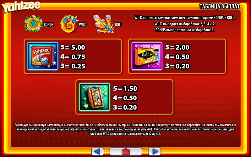 Yahtzee – 5-барабанный бесплатный игровой автомат с двадцатью пятью постоянно активными линиями, на которых образуются оплачиваемые комбинации. В разделе правил есть схема их расположения на экране.