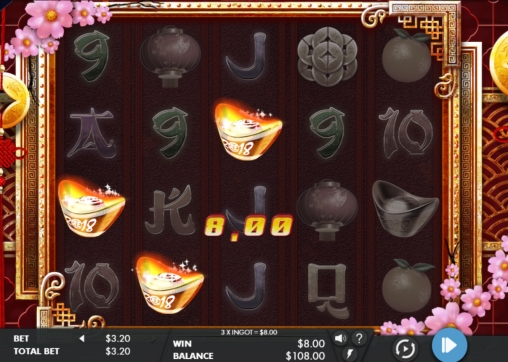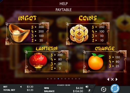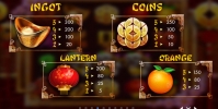 В столбцах игрового автомата Year of the Dog выпадают золотые слитки, монетки с дырочками, красные фонарики, апельсины и стилизованные по иероглифы карточные номиналы. Одинаковые элементы могут выпадать стеками в колонках.