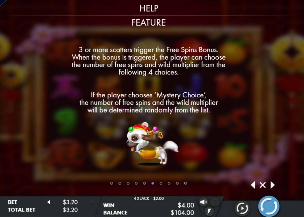 По сложившейся традиции, в канун Нового года по китайскому календарю студия Genesis Gaming выпускает тематический игровой автомат, посвященный животному, который будет символом следующих 364 или 365 дней. В данном случае речь идет о желтой собаке. Она стала героем модели, рассматриваемой в обзоре Casinoz.
