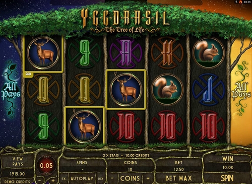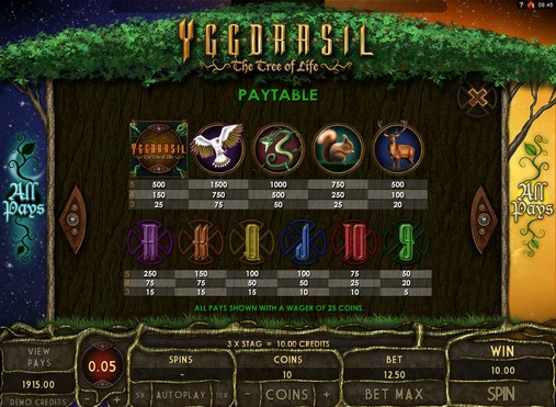 Yggdrasil - The Tree of Life – пятибарабанный видео-слот, в котором нет активных линий. Ставка всегда кратна двадцати пяти. Она может быть от одной до десяти монет номиналом 0.01, 0.02, 0.05, 0.10, 0.20, 0.25, 0.50 и 1 евро (в Next Casino).