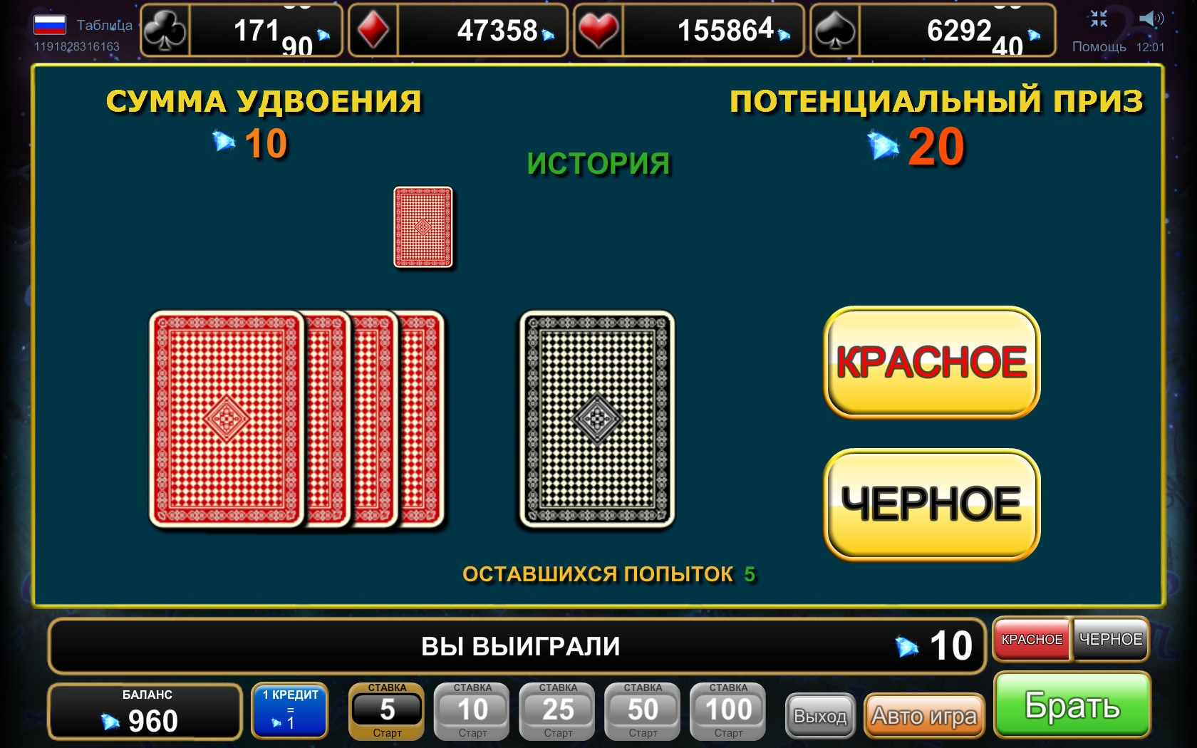 Если спин был выигрышным, вам нужно будет решать, что делать с деньгами. Вы можете их забрать или рискнуть в игре на удвоение.