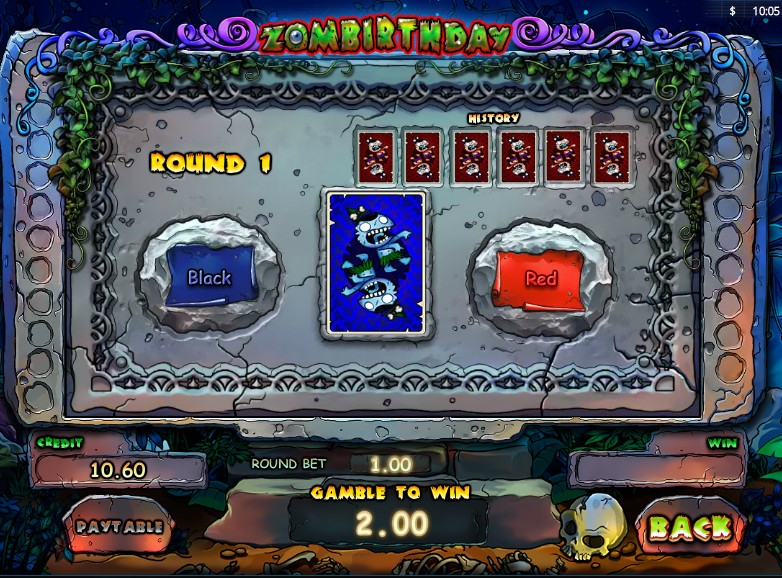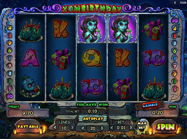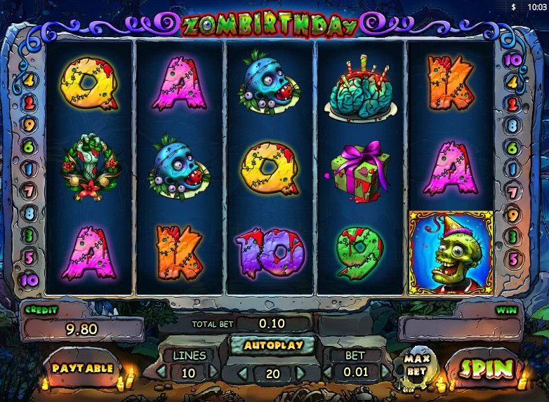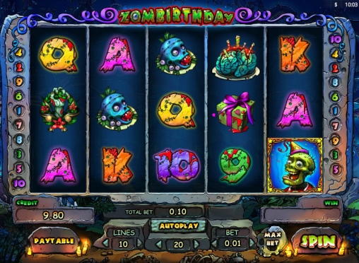 Zombirthday – слот-машина с пятью барабанами, десятью линиями и тремя рядами картинок на экране. В ней представлены обычные картинки, специальные символы, риск-игра по шансам, бесплатные спины с более выгодными условиями, дополнительные множители и другие опции.