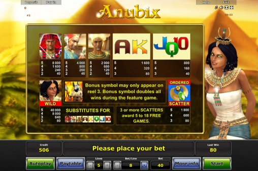 У компании Novomatic подобных образцов несколько, но это не мешает ей время от времени выпускать новинки того же рода. Очередной подобной игрой стал слот Anubix, название которого, очевидно, представляет собой несколько измененное имя Анубис, как звали бога мертвых в мифологии древних египтян. Обзор Casinoz познакомит вас со всеми особенностями модели.