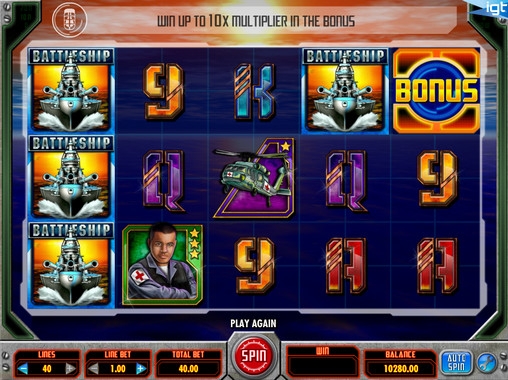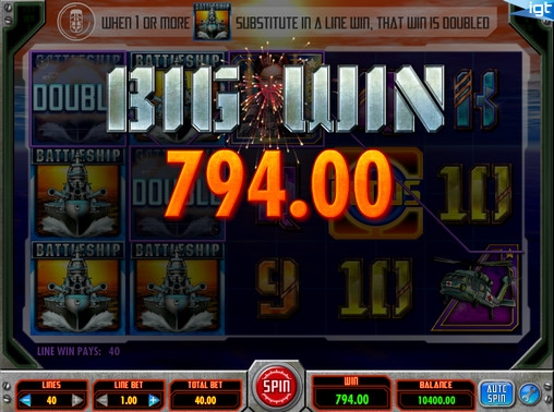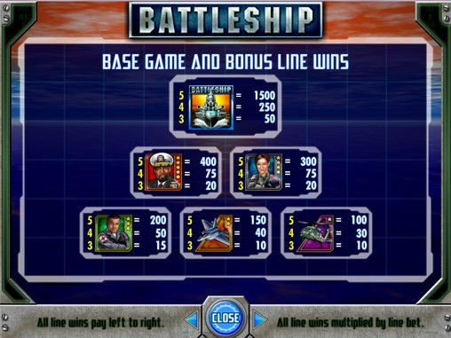 Battleship – пятибарабанный игровой автомат от IGT с сорока линиями и тремя рядами картинок на экране. В данной модели есть особые символы, бонусный раунд с бесплатными спинами и другие функции. Рискованной игры на удвоение в видео-слоте Battleship нет.