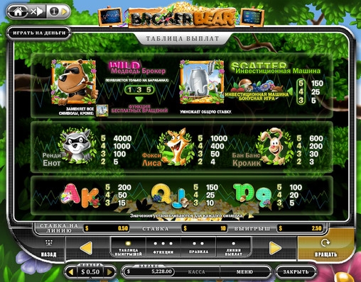 В качестве символам Wild в данном случае выступает Медведь-брокер. Он может выпадать лишь на нечетных барабанах и заменяет другие символы, за исключением Scatter. Когда выпадает три таких символа на названных барабанах, игрок получает возможность 15 бесплатных вращений, после которых вознаграждение может утроиться.