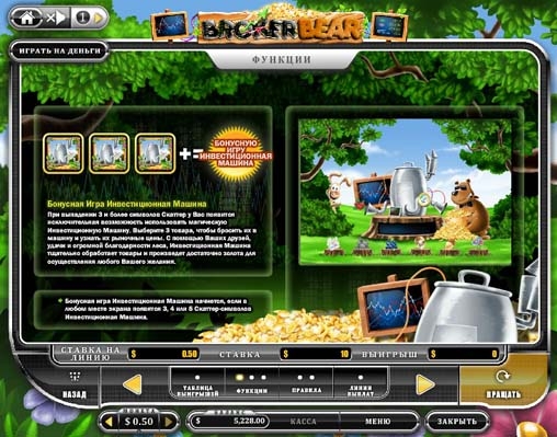 Игровой автомат Broker Bear (Брокер Медведь) – это аппарат для тех геймеров, которых влечет шорох купюр и звон выигранных монет. Доступные дополнительные функции серьезно повышают возможность получить желанный выигрыш.