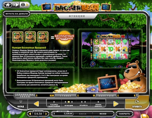 В автомат Broker Bear доступны рискованная игра, прибыльная бонусная игра и призовой раунд, состоящий из 15-ти бесплатных спинов с возможностью получения утроенного выигрыша.