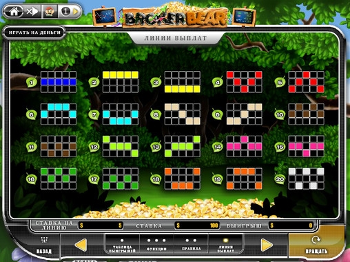 На игровом автомате «Брокер Медведь» услугам игроков предлагаются пять барабанов и двадцать линий. Количество последних, то есть активных линий, для игрового спина можно выбирать на свое усмотрение.