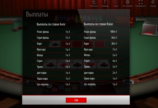 Если же у крупье есть игра, он сравнивает свою комбинацию с рукой дилера. При более сильной комбинации у дилера игрок теряет обе ставки. Если же он побеждает крупье, анте оплачивается 1:1, а рейз – по указанным выше коэффициентам в зависимости от имеющейся комбинации.