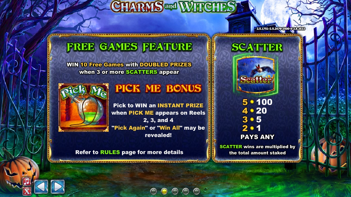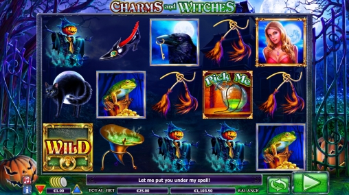 Charms and Witches представляет собой 5-барабанный слот с двадцатью пятью фиксированными полосами и пятнадцатью символами на основном экране.