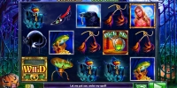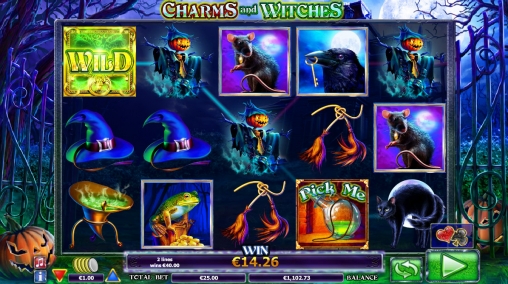 Открыв игровой аппарат Charms and Witches, вы увидите на барабанах колдунью, пугало, котел с зеленым варевом, черного кота, крысу, ворона, шляпу ведьмы, туфлю, жабу и амулет.