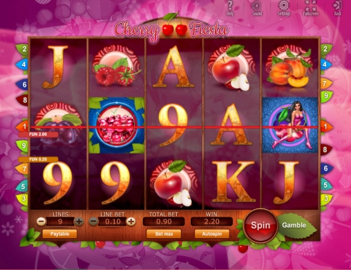 Играть на игровом автомате Cherry Fiesta вы сможете, активировав любое количество доступных линий. При этом на каждую полосу вы можете поставить 0.10, 0.25, 0.50, 0.75 или 1 евро, а на спин принимается не более девяти евро.
