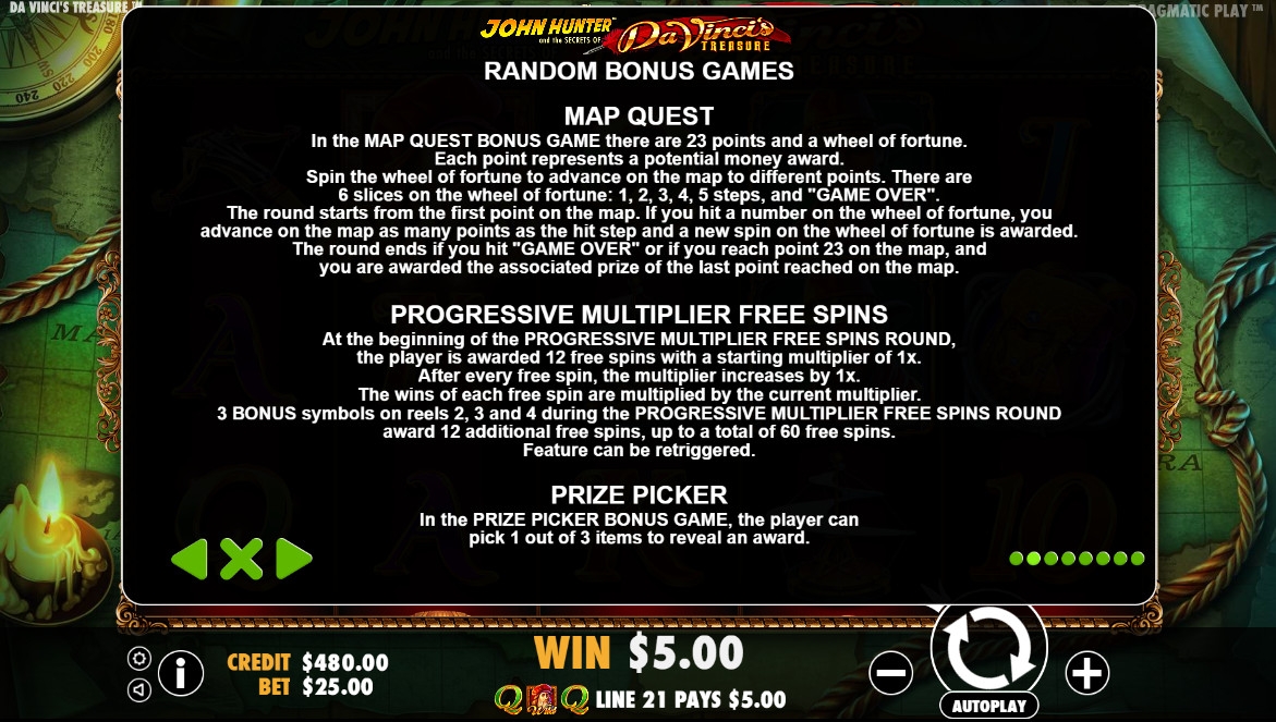 В Da Vinci’s Treasure компания Pragmatic Play не разыгрывает накапливающиеся джекпоты.