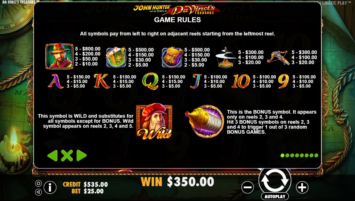 Неунывающий и бесстрашный охотник за сокровищами Джон Хантер отправляется на поиски бесценных изобретений Леонардо Да Винчи – таков сюжет игрового аппарата John Hunter and the Secrets of Da Vinci’s Treasure компании Pragmatic Play. Источником вдохновения для разработчиков, вероятно, стал роман «Код Да Винчи» писателя Дэна Брауна (Dan Brown).