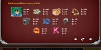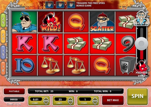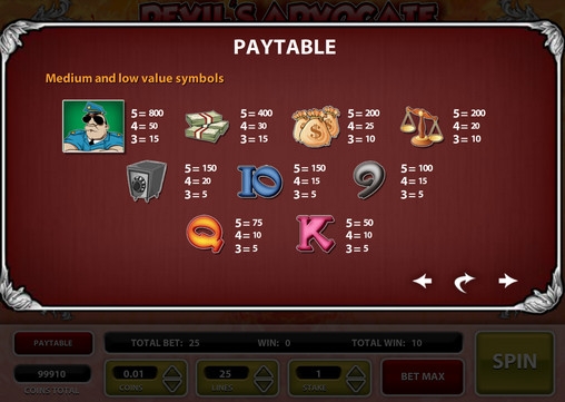 В роли игровых символов в видео-слоте Devil’s Advocate выступают картинки с изображением сейфа, пачек и мешков денег, весов, полицейского, а также букв и цифр 9, 10, Q и K.