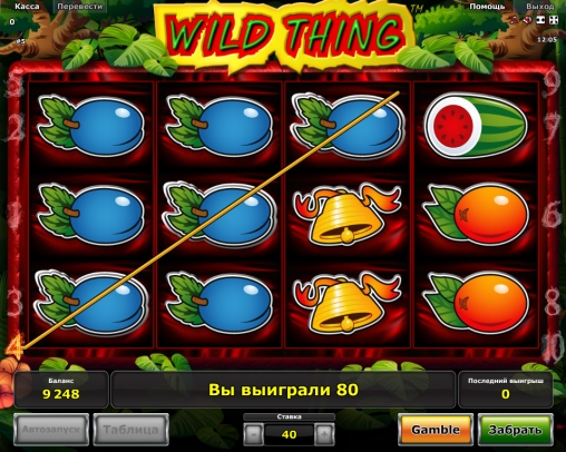 Wild Thing – модель с четырьмя барабанами (что весьма необычно для современных азартных игр данного жанра), десятью линиями и тремя горизонтальными полосами картинок на экране.