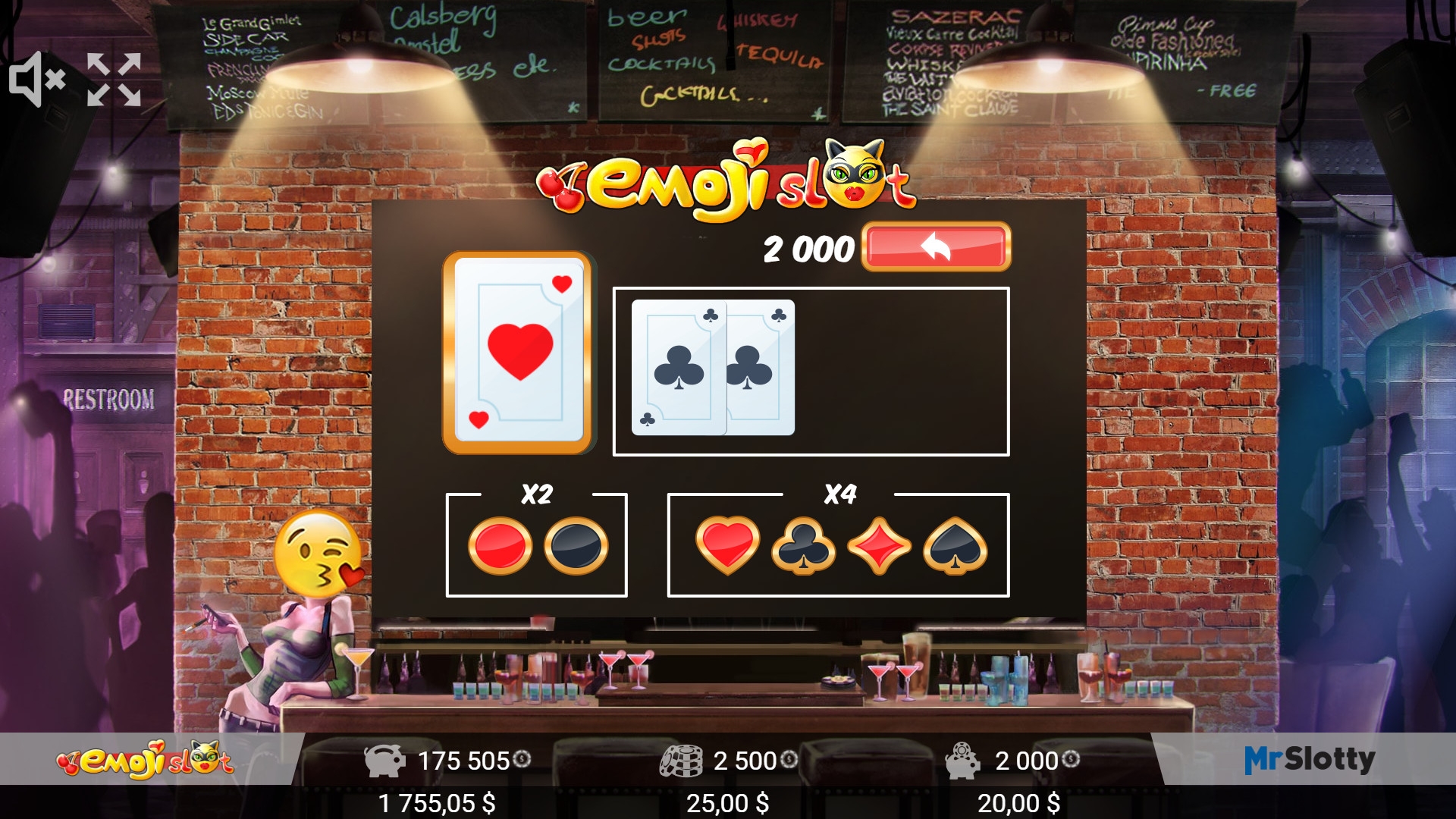 Игра по равным шансам запускается по желанию клиента. Ее можно начать, если была начислен любой выигрыш. Здесь нужно угадывать цвет или масть карты. Правильный ответ в первом случае удваивает выплату, а во втором – увеличивает ее в четыре раза. Можно играть несколько раз подряд, но при ошибке вы остаетесь без всех денег, стоящих на кону.