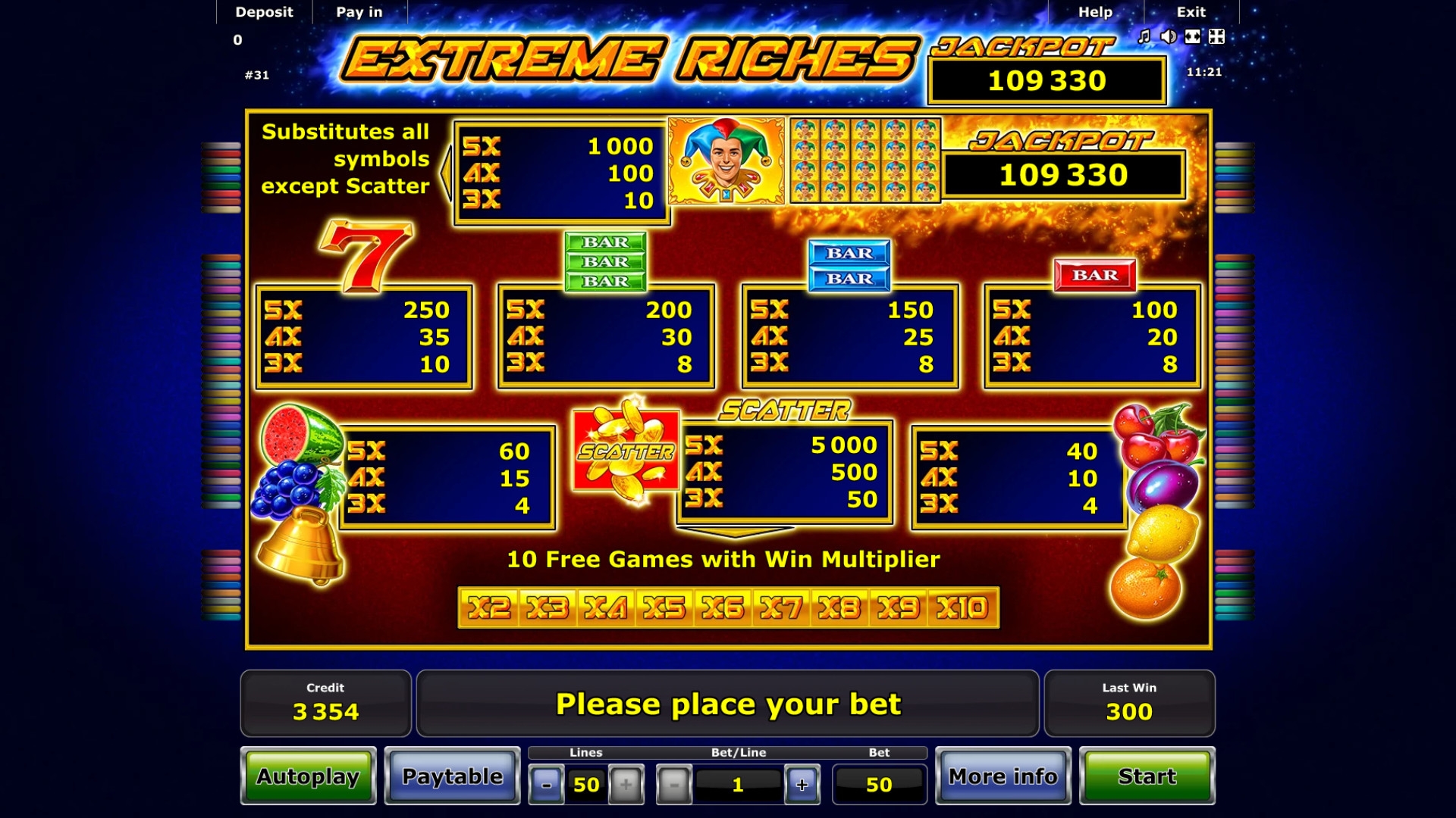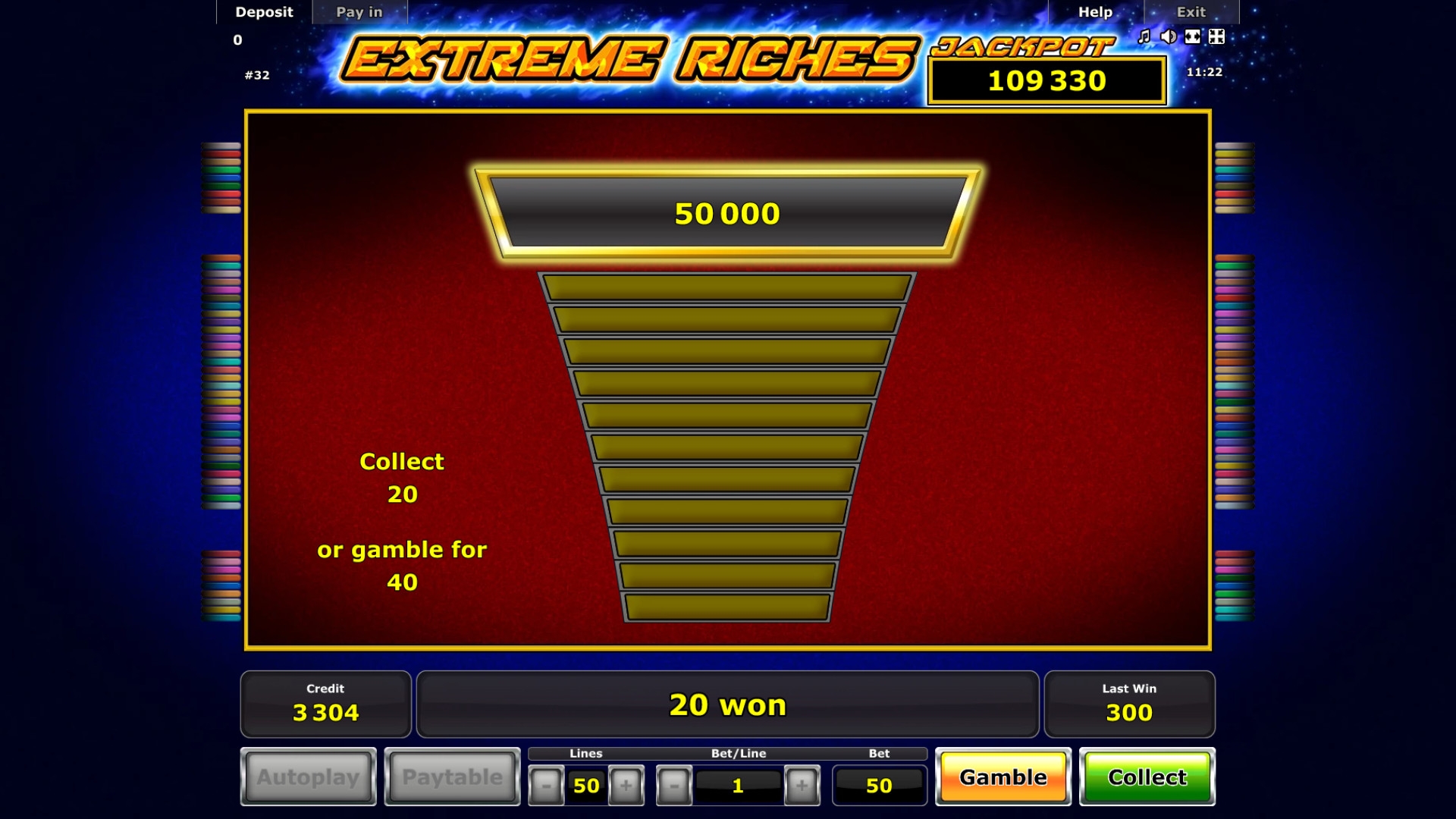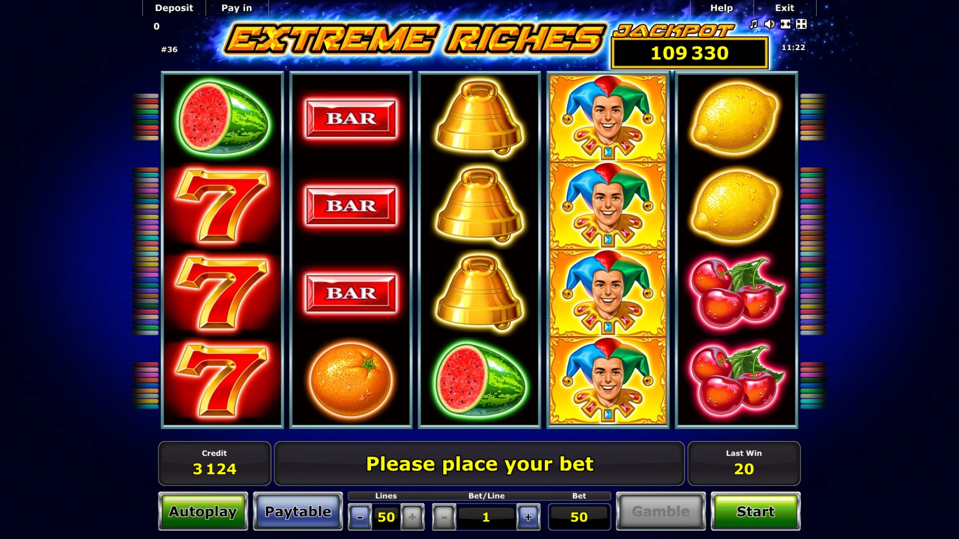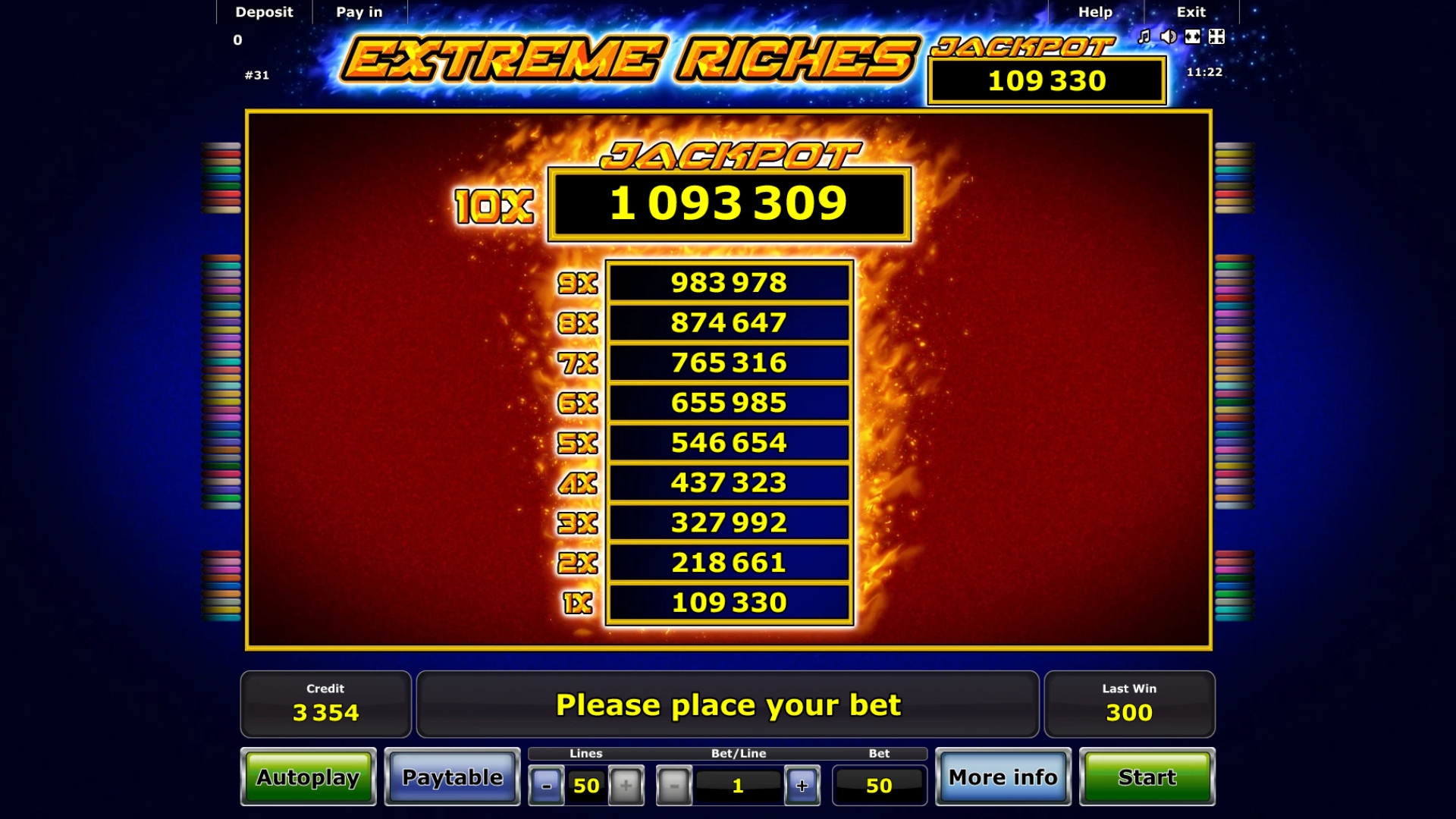 В игровом автомате Extreme Riches пять барабанов и пятьдесят линий, но вы можете задействовать не все полосы, указав нужное вам количество. Диапазон ставок лучше выясняйте в онлайн-казино.