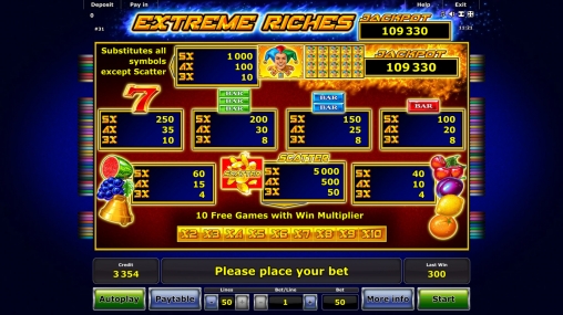 Открывайте Extreme Riches бесплатно на Casinoz. Ставки деньгами на слоте принимаются в казино на лицензионном софте Novomatic.